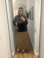 Wore it with a white button down dress shirt, leggings and boots to a casual Thanksgiving gathering. It was a great fit and really comfortable. The only downside is it attracts fuzz like a magnet and pills somewhat easily so watch out around pets and light-colored blankets. I may decide to keep it as it was a really comfortable weight for indoors.