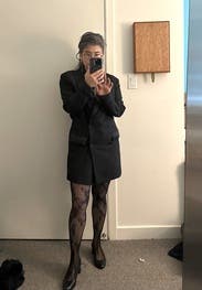 Wore this to a wedding industry event that had a dress code. I had to wear biker shorts underneath because the butt was making too many appearances if I bent over. I also opted to go with the smaller size but left the bottom button undone so the fabric wasn’t tight on my butt. Honestly I considered leaving both unbuttoned and taking the belt off for a street style fashion it too was a vibe!