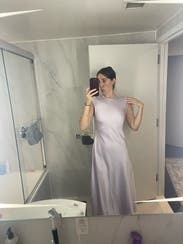 This dress was perfect for a semi-formal event. Fit true to size. Beautiful blush color, material felt great, and the back cutout adds an interesting touch to a fairly simple silhouette. Wish I could keep it but I rarely go out to parties that require looking fancy!