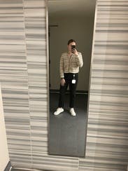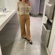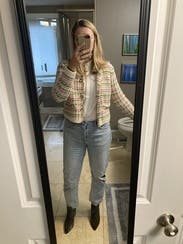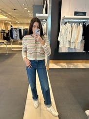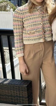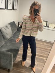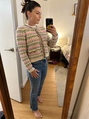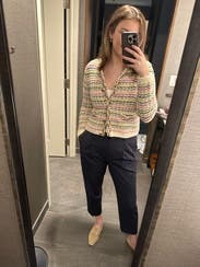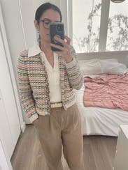 I enjoyed wearing it. It was fun to channel granny-in-spring energy. Loved the colors, texture, and buttons. I didn’t love the overall fit- too boxy and wide in the body, sleeves were too short, and the length was a bit short for my liking. Paired with a white button up underneath to fill this out.