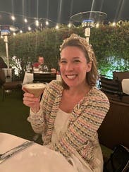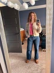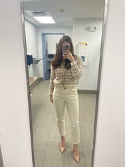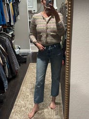 I had high expectations for this number. It hits well on my short waisted body but looks too boxy buttoned. I ended up having to safety pin the button that goes across the chest because it had pulled significantly from other renters and was just hanging. I had plans to keep for a church event with a navy skirt but I think I’m going to swap and try something else.