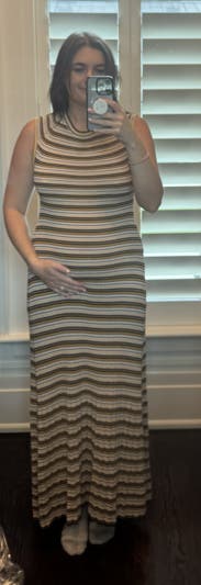 Very comfortable and flattering dress to wear during pregnancy. Material is pretty thick but wasn't too uncomfortable.