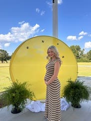 I really like the fit of this dress. The material has a little weight to it and the knit fits nicely around curves. However, the shoulder pads are an odd touch. These were a bit bunched up too, which made it look even more odd. I used my long hair to cover my shoulders. This dress is baby bump friendly!