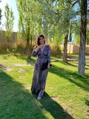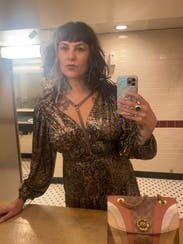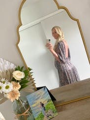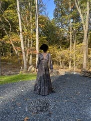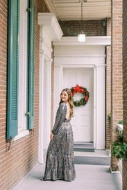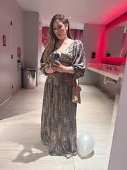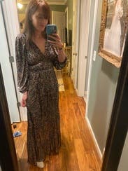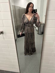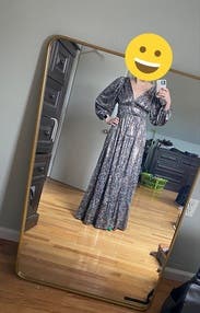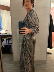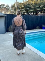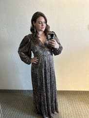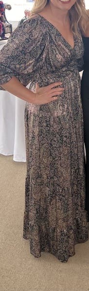 Love, love, love this! The paisley pattern isn’t overwhelming thanks to the sheen of the pattern reflecting the light, and was perfect for holiday photos. The design of the back does tend to want to slip off the shoulders so I did fidget with it to keep the sleeves in place, but it didn’t bother me. The fabric is very lightweight and flowy with a little bit of stretch, and the petite length was perfect for my 5’4” height with 3.5” heels. I was sad to return this one and loved the way it made me feel.
