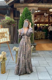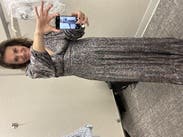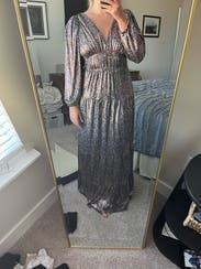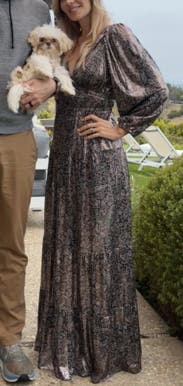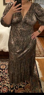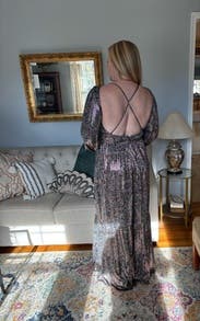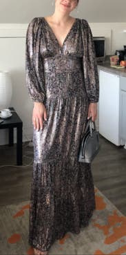 I rented this in my monthly subscription to try on for a future date. There were no reviews and this dress was very curious. If you love maxi dresses this is for You. It's definitely shiny and Metallic, and the sleeves are very billowy. I am 5'4" and I had 3.5" heels in in this picture. This dress could present bra issues with the open back and off the shoulder look, I think ultimately you would need to have stickies. Good option if your looking for a dressed up boho look.