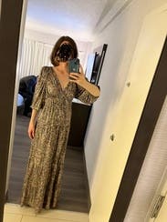I wore this to a work holiday party that was casino theme. It was my backup size to the large, and this fit way better and was not as long. Still full length, but I was able to wear flats and not worry about uncomfortable heels since no one could really see my shoes anyway. I got some compliments, but the best thing was that it was comfortable to dance in and I didn’t feel self conscious about it showing too much skin. It is low cut, didn’t have to wear a bra. Sometimes it would slide off the shoulder, but not too bad. Good for smaller chested women I think.
