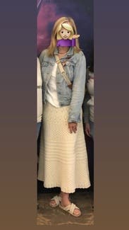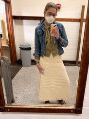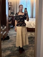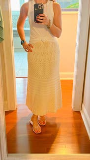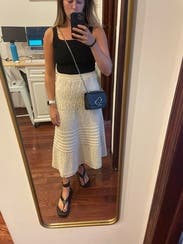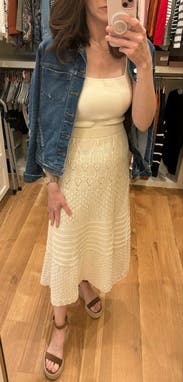This skirt is one of my favorite rentals. The knit material is heavy/thick without feeling hot or bulky. Size medium hit just above my ankles (I’m 5’3”). I had a hard sending this back.