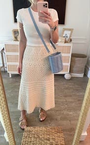 Wore this skirt on the airplane to Italy (9+hr flight) and then was able to style it so many different ways upon arrival - I am obsessed and purchased to continue wearing at home. You can wear it with so many different colors and in multiple seasons. The weight and style makes it perfect for variable/moderate weather. The crochet pattern allows a breeze so you don’t get hot, but keeps you warm in temps from 50s-70s. It’s forgiving with my post-baby body. The elastic in the waist is just right - not too tight, but not loose. You do need some shapewear, bike shorts, or nude undergarments as it is crocheted so semi-see through.