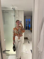 Wore this on repeat! It’s not so cropped that it exposes anything when worn with higher waisted pants. It’s cut generously so if you’re between sizes, go down. If I rent it again I will drop down to a medium.