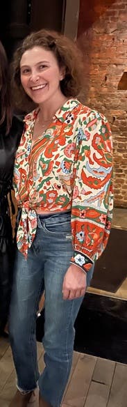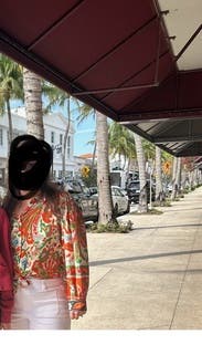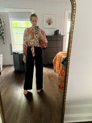 The print is fun vibrant AND goes with everything. I wore this with jeans, white wide leg pants, bright shorts. This blouse rocked them all. Can’t wait to rent again and with the matching pants.