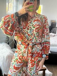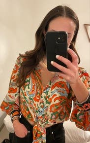 I loved this top! The print is really bold and not sure i would have loved it together with the matching pants. As always with this brand the fabric was very nice and the fit as well. I’m figuring out my size postpartum but wish i would have gotten the XS which would have been my pre pregnancy size.