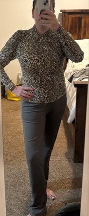Got lots of compliments on this shirt with baggy black pants. Super flattering. The zipper on the back was slightly uncomfortable after many hours but overall the shirt was very comfortable