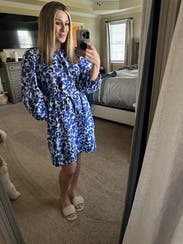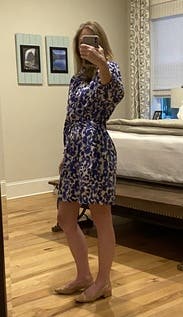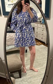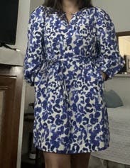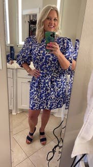 This dress looks better in person than I was able to capture in a photo, it’s very cute. The puffy sleeves felt a bit 80s retro. It was perfect for an end of summer casual cocktail hour. The cut is generous with a belt that ties at the waist, making it suitable for almost anyone. I usually wear a 4, sometimes 2, and this fit well. I might have ordered the 2 instead due to the generous fit, but I didn’t want it to be any shorter (I’m 5’2” and this is about as short as I like to go). The blue is a pretty color, the background color is more off white than a true white, which I didn’t think I would like, but once I put it on I loved it. A great combination of style and comfort. I wore platform sandals but think it would look really cute with white sneakers or flats. Will definitely wear again before returning.