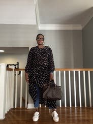 Don't let this one slip past you. I dressed it down and layered it up. Leggings because it's a tad sheer and cold out right now. But def so many fun ways to style it. @the.nay.edits for my rental styles and more.