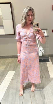 The ruched bodice is forgiving. This is a very lightweight fabric, so it shows every curve. I really enjoyed the longer arm on the sleeve. Overall, I loved this dress.