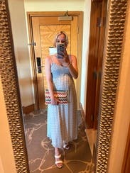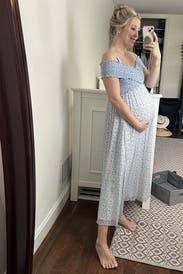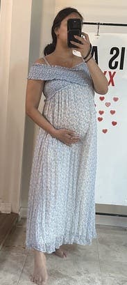 Some of the earlier reviews made me nervous to rent this dress (lots of complaints about the shoulder straps, top being too loose or awkwardly showing side boob), but I didn’t have any issues with it! I’m petite and normally flat chested, but currently six months pregnant, and this fit beautifully. The fabric is high quality and definitely elevates this dress from standard sundress to “resort elegant” (that was the dress code for the dinner I wore it to in the Bahamas). Definitely recommend for expecting moms, or anyone who wants something flowy and formal!