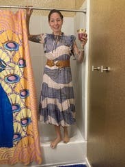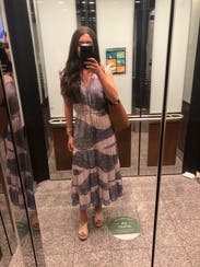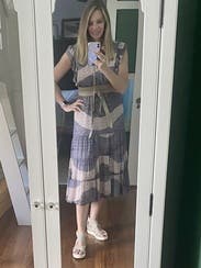 I rented this dress for its a pattern, The color of the dress in person is more pink than the picture I viewed which looked more grayish. Unfortunately the material of the dress made it absolutely horrible for the fun day of sightseeing and hanging out in Nashville I planned - it's just too itchy! I was really glad I had a backup dress that I got from RTR and it worked out perfectly.