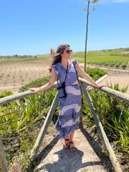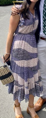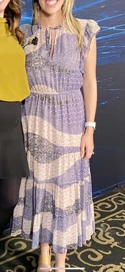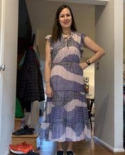 The dress was SO comfortable. I loved moving in it, and it made me want to dance! Even untied, the slit stayed put and didn't make me feel too exposed. The ruffles on the sleeves were enough to make if feel more like short sleeves and less like sleeveless. I was surprised by the color - it's blues/purples and pale pink, not blues/purples and white. The waist elastic was about 1" above my natural waist. That is the only thing I would have changed about this dress.