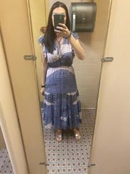 I received many compliments. I wore it to a brunch with nude wedges. I left the tie at the neck open and wore a simple necklace. There is an elastic waist, so if you have a little stomach like me it will stick out. But it looked fine with control-top, high-waisted underwear. Someone else said that it is more pink and blue and that is correct.