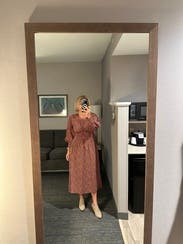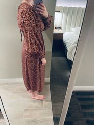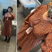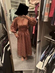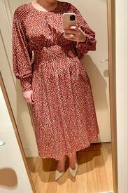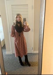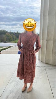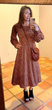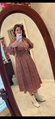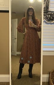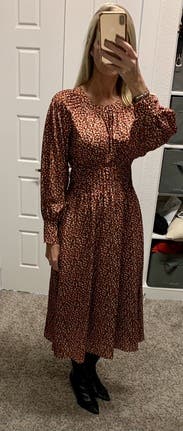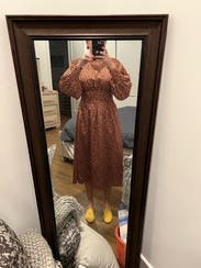 I wore this dress for my birthday. We were at an outdoor brewery because Covid is so bad right now. I wore thick leggings underneath, cognac brown boots, and a warm shirt underneath. The sleeves were large and puffy. At first, I was a little embarrassed. I felt like an old lady going to church. Everyone else said it was stylish, trendy, and pretty. It was fun for a 1 time wear. I am contemplati wearing it to work before shipping back tomorrow.