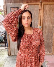 I felt like my boobs looks amazing in this dress even without a bra, and then it cinches in at the waist creating a very flattering shape. Very comfortable on the arms with a loose cut. The dress is actually burnt/dark orange with black and white speckles.