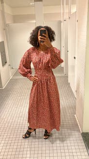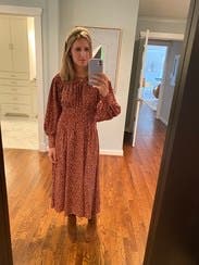 I took a chance on this because the print and color are gorgeous, but the fit was awful for me. The thick smocked band at the waist combined with the high neckline emphasized my bust oddly. I didn’t wear this.
