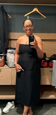 Not see through | No pockets | Double lined | Petite friendly | Tall girl friendly | Structured Silhouette | strapless or braless recommended | Mid-weight | Back zipper | Back hook and eye | No stretch | Back vent
