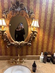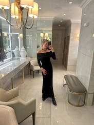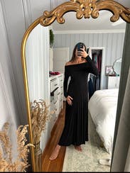 I rented this Beatrice .b off-shoulder dress for a mountain wedding, and it ended up being such a timeless, elegant choice. The long sleeves and draped neckline felt sophisticated and seasonally appropriate, and the flowy skirt had the perfect amount of movement — classic but understated. I ordered a medium, which fit fine overall, but I probably could’ve gone with a small for a neater fit through the arms, shoulders, and waist. The sleeves ran a bit long, and the neckline did need occasional adjusting (pretty typical for an off-shoulder cut like this). Styled it with a vintage fur wrap for warmth, and it was the perfect mix of old-world and modern.