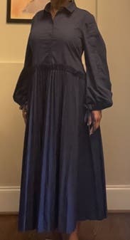 Beautiful color, easy cotton fabric, and an exciting extras. I got so many compliments on this dress, and felt comfortable and confident in it all day at work. I can see why it would not be a great fit for everyone, including petites, because it is wide, and there is a lot of drama with the pleating and the sleeves. but if you’re looking for that type of energy or don’t need everything to be nipped in at the waist, you should give this one a try!