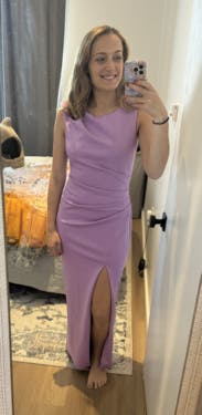Loved how it felt! Super soft. Stretchy. 8 weeks postpartum so I felt like I needed the ruched midsection. Also had no idea what size I would need. Probably would’ve looked better in a 12, but I wanted it to be tight. I probably also would’ve looked better in the navy dress I got, but this event you’re supposed to wear purple.