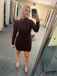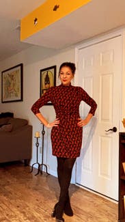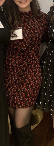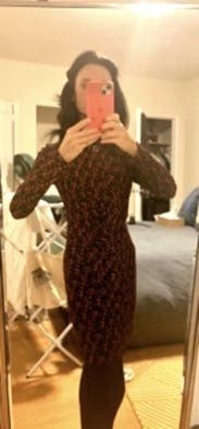 Wore this for a fundraiser. Such a flattering cut/pattern. Usually with a more form fitted dress you see my stomach pooch more but the way this pattern is laid it really hid all of that and made me feel snatched. Only slight con was the length was a little too short since I have a butt, but was able to fix with black tights and knee high boots