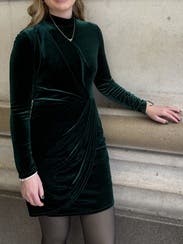 This dress is perfect for holiday parties! Tight and fitted but plenty stretchy, warm long sleeve but short and a bit sexy. Super flattering and got tons of compliments! The color is a perfect deep emerald green (the photo is misleading)