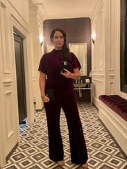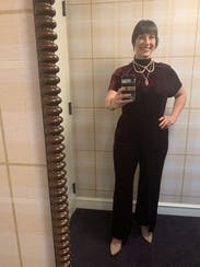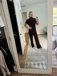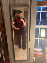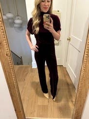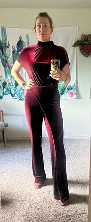 This jumpsuit was awesome! Sorry for the dirty mirror but I didn't take any other pictures. I'm 5'7" and wore conservative sized heels and I thought the length was a little short, not like the other reviews that say it was long. I'd rather have it touching the ground than see too much shoe. The color was beautiful, it was super comfortable and flattering, and practical for northeast winter date night. There's an extra slice of fabric on the right leg but I liked it, it was different. Loved it