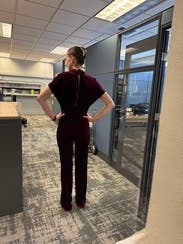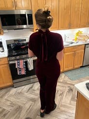 Received tons of compliments on this jumpsuit. Beautiful material - super soft and stretchy, and very form fitting. Love that this is a tie back; gives it an extra elegant, sexy touch with the added bonus of making it easy to use the bathroom. The jumpsuit was very long on me, even with 4” heels on, so I had to be careful when I walked. Would love to purchase!