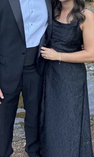 Absolutely loved this dress. Usually 2-4 and sized up- glad I did because the top is stiff. I’m 5’2 and wore 3 inch heels and it was right on the ground. Def a good go-to black tie dress and was comfy all night!