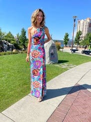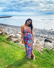 I wore this dress to a formal event in Southern California and it was perfect! The colors are gorgeous and it was actually long enough for me! The chest was too tight for a regular bra, so be prepared with a stick on. My only issue is that it wasn’t that comfortable to sit in and we did way too much sitting at my event.