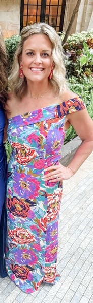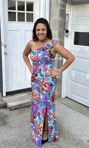 I rented this dress for a formal wedding in June. I was a little hesitant about the pattern of this dress when I first received it in person, but it looked stunning in photos. The fit was super flattering and comfortable -- I loved wearing it! Received endless compliments throughout the night. I absolutely recommend this dress! As I am usually a 00P I am saying this dress runs small bc the 0P fit me well.