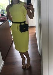 Easy to wear outfit. Both comfortable and functional. The silhouette was very flattering. Since I wore this to work the length was perfect. On the hanger the color looked a little squeamish, but on it really transformed into a bold but flattering tone. A whole bunch of students at the school I work at wanted to touch the dress because the material looked "leathery" to them. As with all the black halo brand outfits this does not disappoint!