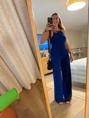 I love this jumpsuit! The color is 👌!! Wore wedges with them. This was my back up for the wedding from last weekend. I ended up keeping them and wore them running errands. Received compliments all day! 💙💙💙