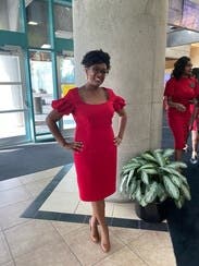 I wear 14 in all black halo except this one- I had to size up to a 16. I wore this to a day wedding and an evening party. A true red, lots of compliments