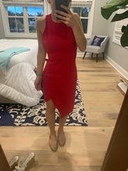 I did not end up wearing this dress. It was very large in the chest area (I'm 32A) but perfectly fitted in the middle (~110 lbs). The length was also not too short on me (5'3''). I was planning on wearing it to a wedding but even a super padded bra wouldn't have made up for all the extra fabric on top. Online it looked like a red dress but in person it has more pink/fuchsia tones.