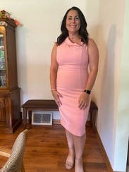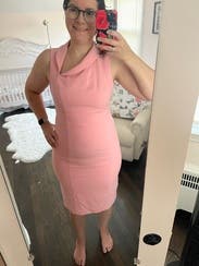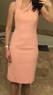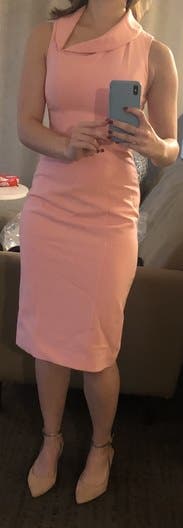 I am contemplating buying this dress and the only thing holding me back is the color is so unique, you could not wear it all the time. Extremely flattering and slimming. Hue of the pink looks amazing with a tan and blonde hair. Length is professional and cut of the neckline elegant and eye catching. It is a little harder to get on as it is not a full zip (the very top is connected) but comfortable when you get it on. I got non-stop compliments!