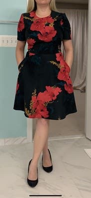 Flattering silhouette and POCKETS! Like the other reviews, there is little to no give around the midriff/waist so might consider sizing up. Overall very pretty floral pattern and great for any formal event.