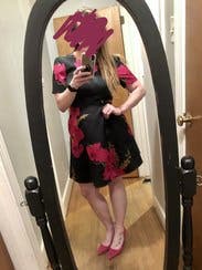 I wore this dress to work, but it could easily be worn to a semi-formal affair. All day long people were stopping me to complement the dress, even people I didn't know! I am usually between an 8-10, as sometimes things don't fit my hips. But this dress fit perfect! At first it seemed a little tight around the arms/chest and I thought I wouldn't have full range of motion. However, it didn't bother me at all. I was even able to reach all around to straighten my hair wearing it. Something that may not be noticeable in pictures: It looks black with green leaves and pink flowers. However the dress is actually a DARK GREEN, with green leaves, and pink flowers. This was something I really liked about it, but if you are looking for a black dress, this is not the one.