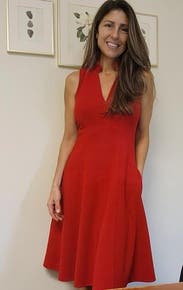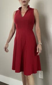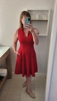 This dress is a bit of a conundrum in that it has A summer silhouette, but very heavy weight material. That said, the cut is beautiful and the color is a lovely deep red. This will be a fantastic holiday party dress.