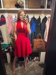 Hubby helped me pick this out for his law school graduation. It was a beautiful dress!! The color was amazing, there was a little sexy cleavage without being over the top. It was a thicker material, so didn't look skimpy. Might be one of my favorite rentals. Although the happiness of the day might have something to do with that too...