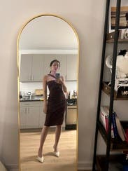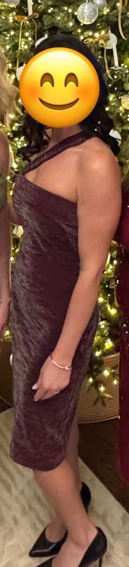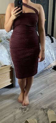 This dress was snug but the liner helped smooth it out. It has a sheen to the burnt maybe color- perfect for fall or winter. The strap took a minute to get used to but I did not find it to be uncomfortable. Loved the knee length. Just enough different to be noticed