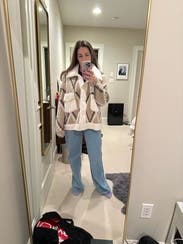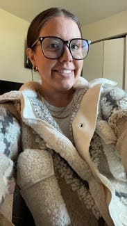 I wore this so many times, and considered keeping it. I sized down to an XS and it was still oversized. You’re able to dress it up or down, it’s really versatile- I wore it with jeans, leggings, a dress, and skirt. It kept me warm (sometimes too warm) during SoCal winter.