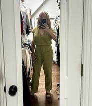 The color of this jumpsuit is beautiful in person; great for spring and summer. It fit my long torso and I was able to sit and move around comfortably without any riding up. I’m more of a pear shape and typically range between a 6-8 on bottom; the S fit my bottom half but it was on the snug side. The top is huge and billowy - I wore a bodysuit underneath and secured the gap with fabric tape which helped. It wrinkled easily. Little to no stretch in the fabric. The zipper and two buttons give definition and some visual interest in the waist. If it weren’t for the color I would not have liked this very much. This was good for a night out with friends but I probably wouldn’t rent again.