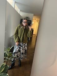 I ended up buying this jacket because I just couldn't take it off. Warm, cozy and really stylish with the leather and oversized vibe.